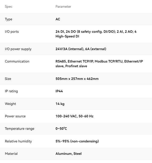 Secara default, cobot ini dikirimkan dengan Standard Controller AC (ukuran: 505 x 462 x 257mm; berat: 14kg) untuk mengelola semua operasi cobot. OEM Controller AC/DC dengan desain sangat kompak (495 x 200 x 170mm; berat: 7,1 kg) tersedia sebagai opsi alternatif.